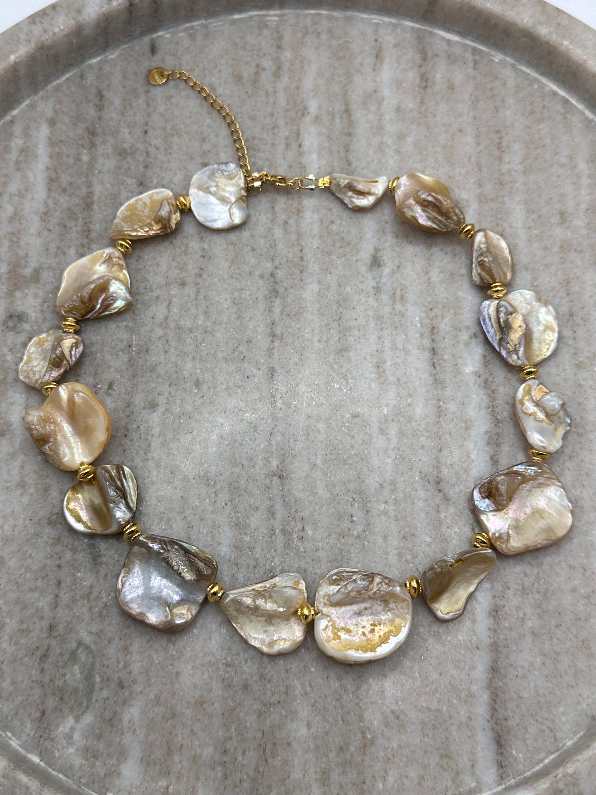 Αναδείξτε την κομψότητά σας με το Aurora, ένα εκλεπτυσμένο κολιέ εμπνευσμένο από τη φυσική ομορφιά της θάλασσας. Κατασκευασμένο από αυθεντικά, ακανόνιστα κομμάτια κοχυλιού με ιριδίζουσα λάμψη και διακριτικές χρυσές λεπτομέρειες, το Aurora αποπνέει διαχρονική φινέτσα.