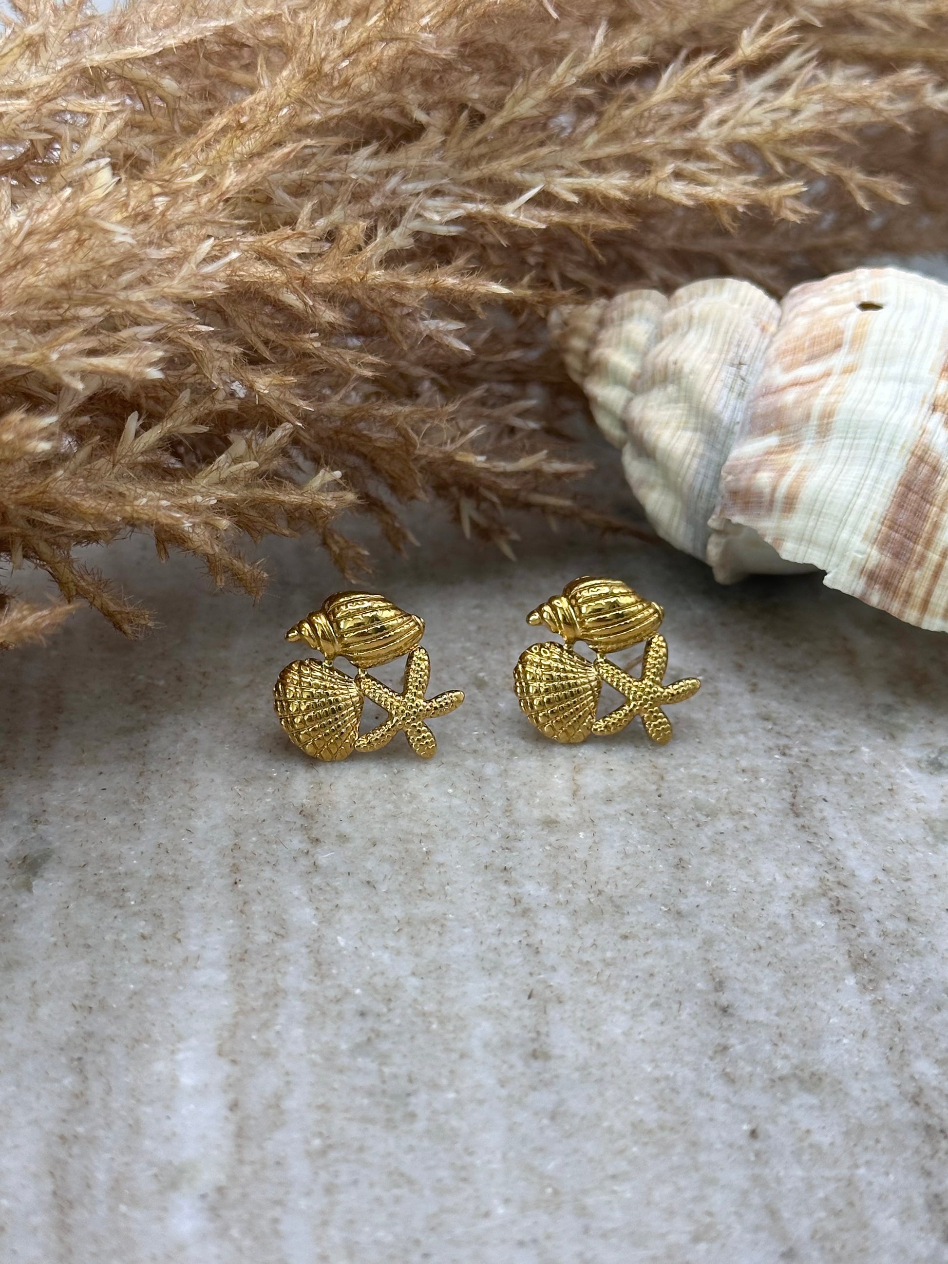 Αναδείξτε το καλοκαιρινό σας στυλ με αυτά τα υπέροχα χρυσά σκουλαρίκια καρφάκια με κοχύλια και αστερία. Κάθε σκουλαρίκι διαθέτει λεπτομερή σχέδια από τρία θαλάσσια μοτίβα – ένα αστεράκι της θάλασσας, ένα καλοσχηματισμένο κοχύλι και ένα σπειροειδές κέλυφος – όλα σε λαμπερό χρυσό τόνο. Ιδανικά για όσες αγαπούν τη θάλασσα και τα κομψά, θερινά αξεσουάρ. Ελαφριά και κομψά, φοριούνται εύκολα τόσο σε καθημερινές όσο και σε πιο ιδιαίτερες εμφανίσεις.