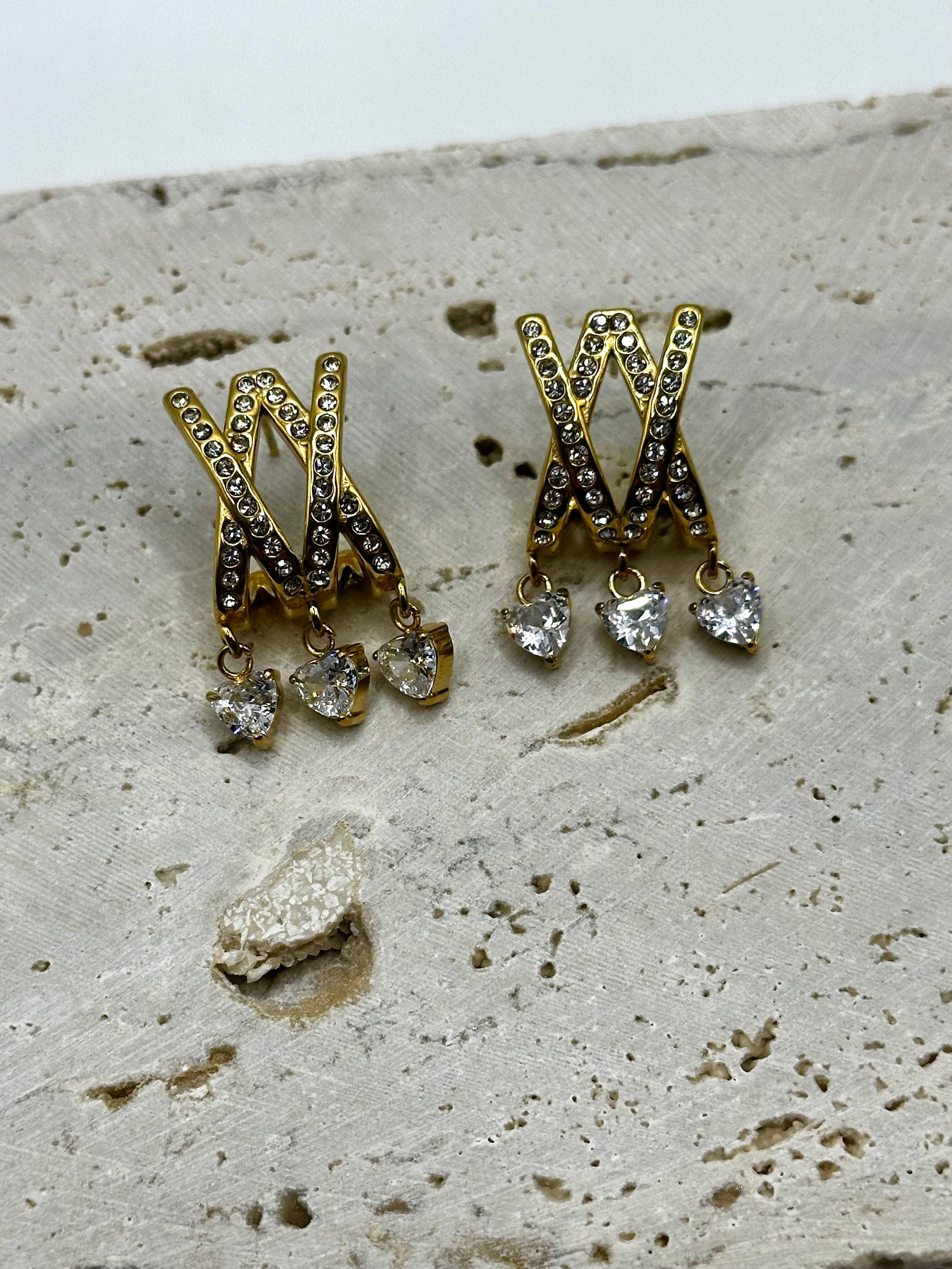 Πάντα ήθελες να κάνεις τριπλό layering αλλά έχεις μόνο μια τρύπα στο αυτί σου ;Κομψά σκουλαρίκια με τρία μικρά κρεμαστά μοτίβα καρδιάς — ένα με μεγάλο ζιργκόν, ένα με λείo χρυσό φινίρισμα και ένα μικρά ζιργκονακια που λαμπυρίζει σε κάθε κίνηση.